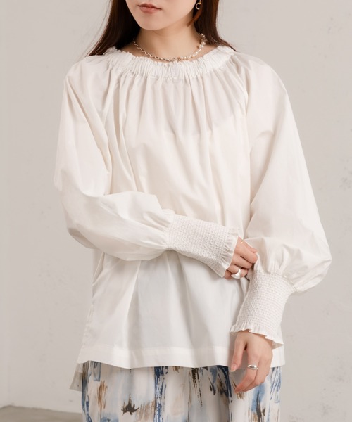 ギャザーで華奢見え抜群な、 ボトムを問わず着回せるデザインブラウス 【デザインポイント】 ふんわりとしたボリューム袖が大人フェミニンな ギャザーデザインブラウス。 袖の絞り部分も長めの作りで 腕まくりしても落ちてこないので安心です。 長さも前後差のあるデザインなので ボトムインしなくてもすっきり見えします。 【素材】 タイプライター素材なのでシワになりにくく、 しっかりとした張り感が特徴です。 透け感も強くないのが嬉しいポイントです♪ 【コーディネート】 シンプルにデニムパンツはもちろん、 今年らしい柄のパンツ合わせもオススメです。 ボトムインするとウエスト周りがふわっとなり メリハリが出るので、ロングスカートやタイトスカートとの 相性も抜群です♪ ---------------- 透け感/白のみややあり 伸縮性/無し 裏 地/無し 厚 み/薄手 ---------------- ※サンプルにて撮影をしておりますので、実際の商品とは色味・仕様や加工・サイズ等が若干異なる場合がございます。予めご了承くださいませ。 ※商品の取り扱い方法につきましては、タグ等に記載されている「取り扱い上の注意」「洗濯表示」をご確認ください。 ※屋外での撮影画像は、光の当たり具合で色味が違って見える場合があります。あらかじめご了承ください。なお商品の色味は、スタジオ撮影の画像をご参照ください。 ....................≪INFORMATION≫...................... ▼ 商品のお気に入り登録 ▼ 完売カラーの再入荷やラスト1点、またプライスダウンしたセール通知を受け取ることができます。 ぜひご登録ください。 ▼ ブランドのお気に入り登録 ▼ 新商品や再入荷など、ブランドのお得な情報をいち早く受ける事が出来ます。 ぜひご登録ください。