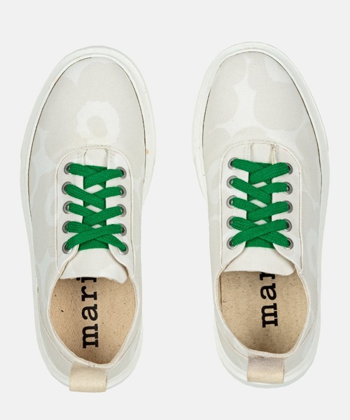 『Marimekko Kioski』 マリメッコのアイコン的プリントを再解釈し、無限のワードローブをジェンダーニュートラルなストリートウェア Marimekko Kioski(マリメッコ キオスキ)。提案する。「他人の真似はせず、自分らしく」をキーワードに、作り物ではない。オーセンティックなスタイルを追求したコレクション。【テキスタイルデザイン:Maija Isola(マイヤ・イソラ)】MINI UNIKKO(ミニ ウニッコ):小さなケシの花コットンキャンバス地にミニウニッコプリントをあしらったローカットスニーカー。鮮やかなグリーンのシューレースがワンポイントに際立つデザイン。かかと部分にはループ付き。ボリューミーなソールで今季らしい雰囲気に仕上げています。【サイズ目安】36:22.0-22.5㎝37:23.0-23.5㎝38:24.0-24.5㎝39:25.0-25.5㎝※断裁により商品ひとつずつの柄の出かたが異なるため、表示画像のディテールと多少異なるデザインのものが届く場合がございます。予めご了承ください。