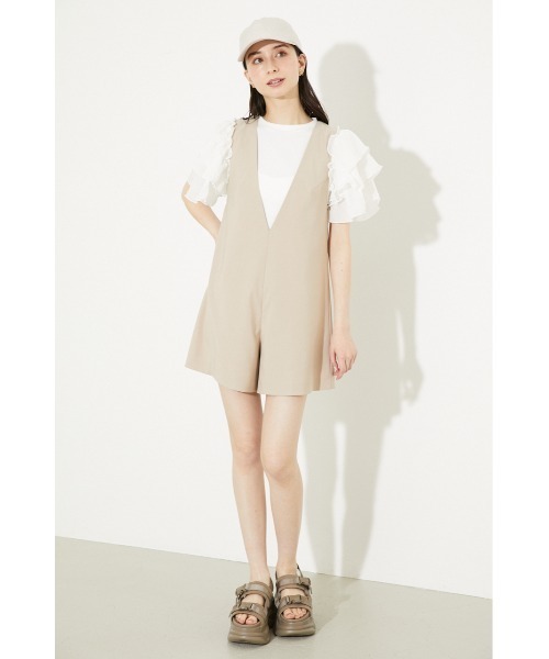 ストンとしたルーズなシルエットに深いVネックのデザインを加えたショート丈ロンパースです。スポーティとファミリーを融合させたriendaらしい大人な雰囲気が表現します。スポーツがトレンドのキーワードとなる2022年は、ヘルシーを表現するショート丈のアイテムはかけないです。スニーカーサンダルと合わせて今年らしいスタイリングがお勧めです。カラーは定番の着やすいBLK、BEGと春らしいPURの3色展開です。