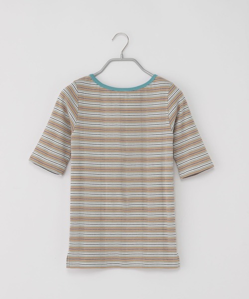 1枚は持っていたい、 コンパクトサイズ2WAYトップスレトロなカラーが目を惹くオリジナルのマルチボーダーTシャツ。首回りがスッキリとした女性らしい抜け感を与えてくれる前後2WAYデザインです。透けが気になりづらいコットンリブ素材。リングドットがついた長めの前立てはさりげないアクセントに。襟元は配色になっているのもポイントです。体のラインを拾いづらい適度な余白を残したコンパクトサイズはインナーとしてもおすすめ。