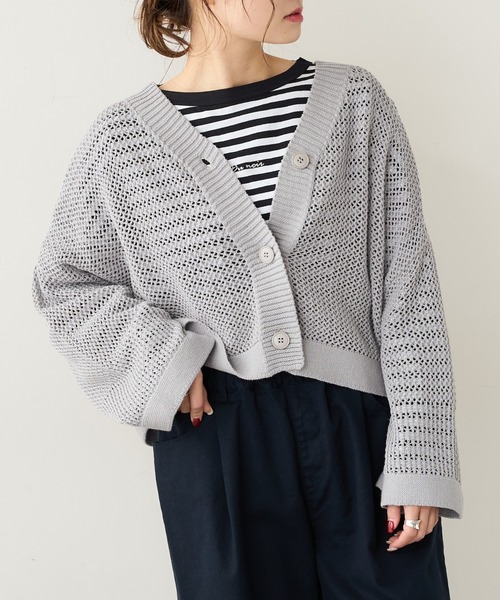 ピュアルセシン 2022 spring collection【Loose and classical】 ◇ナチュラルな透け感がトレンド感のある着こなし◇ ●デザイン メッシュニットのナチュラルな透け感がトレンド感のあるカーディガン。 すっきりとショート丈のデザインはハイウエストのボトムと相性抜群。 ゆとりのあるオーバーサイズは着心地の良さはもちろん Tシャツやブラウスなどレイヤードのしやすさもポイントです。 ●カラー展開 ライトグレー/サックスブルー/ブラックの3色展開。 ●素材 ドライタッチなコットン素材。 丁度良い厚みで季節の変わり目に重宝します。 ●スタイリング ロゴTシャツやタンクトップなどインナー次第でロングシーズン着用できます。 ハイウエストのボトムを合わせればスタイルアップ効果がさらに上がります。 =============================== 透け感:あり 裏地:なし 伸縮性:あり 光沢感:あり 生地の厚さ:普通 【スタッフコメント】 年齢:20代半ば/身長:154cm/普段着用サイズ:Mサイズ サイズ感:ウエスト程のショート丈で脚が長く見えます。 素材感:さらりとドライタッチで春や秋など季節の変わり目に重宝しそうです。 =============================== ※撮影場所やお使いのモニター環境により若干お色味が異なる場合がございます。特にロケの撮影では明るく見える傾向にございます。 ※予約商品はサンプルで撮影をしております。若干の仕様が変更になる場合がございますので予めご了承の上ご注文くださいますようお願いいたします 。