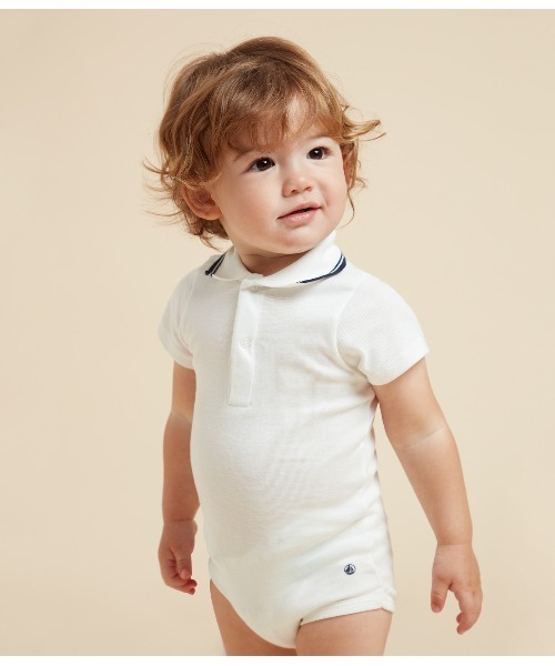 清潔感あるピュアホワイトの衿付き半袖ボディです。衿にあしらわれた2本ラインが、プレッピーな趣きを演出しています。股下と胸元には扱いやすいスナップボタンが施されているので、外出時のお着替えも簡単。カジュアルからお出掛けまで幅広く着回せるアイテムです。
