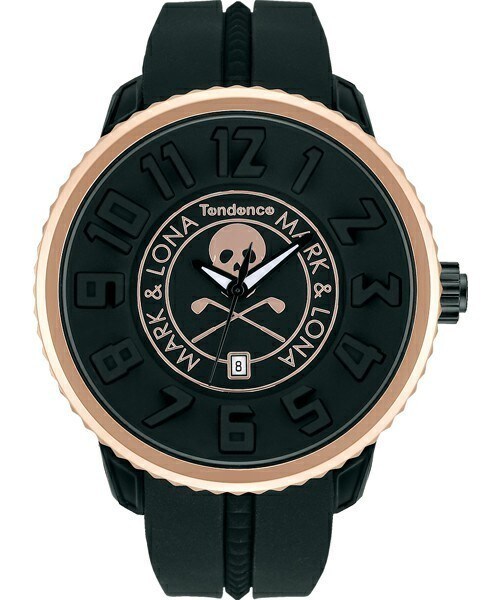 Tendenceの代名詞ともいえるガリバーシリーズ。 サブコンセプトの"Larger than Life"はこのシリーズのデザインとシンクロし、 腕元に存在する自己表現のアトリエとなるでしょう。 スイス生まれのファッションウォッチ「テンデンス」とラグジュアリーゴルフブランド「マーク&ロナ」の初となるコラボレーションモデルが誕生しました。 テンデンスの遊び心溢れる世界観に、ラグジュアリーな大人のスポーツでもあるゴルフが融合したら… そんなアイデアから生まれた今回のコラボレーション。 マーク&ロナのキャッチーなアイコン、スカルを前面にデザインし遊び心を忘れない優雅な大人にピッタリなカラーリングとケースサイズでシーンを選ばず使用できます。 ケースサイズ50mmのガリバーラウンドタイプ3種類、 47mmのスリムタイプ2種類、各300本限定です。 ・日本製クォーツムーブメントを搭載。 ・10気圧防水なので、水上のスポーツなどでも安心してご使用いただけます。 ・横幅50mmのビッグフェイスは抜群の存在感。 ムーブメント クォーツ(MIYOTA 2115) ディティール 表示方式:アナログ ケースの形:ラウンド型タイプ 文字盤カラー:ブラック ベルトカラー:ブラック サイズ ケース幅:約50mm ※リューズ・ボタン部分は含まれません 重さ:約87.5g 腕回り:約12.5cm ~ 20cm 素材 ケース:ステンレススチール&ナイテックTR90 ストラップ:シリコン ガラス(風防):ミネラルガラス スペック 防水性能:10気圧防水(100M防水) 機能:日付表示機能・300本限定 付属品 セット内容:箱・取扱説明書・保証書
