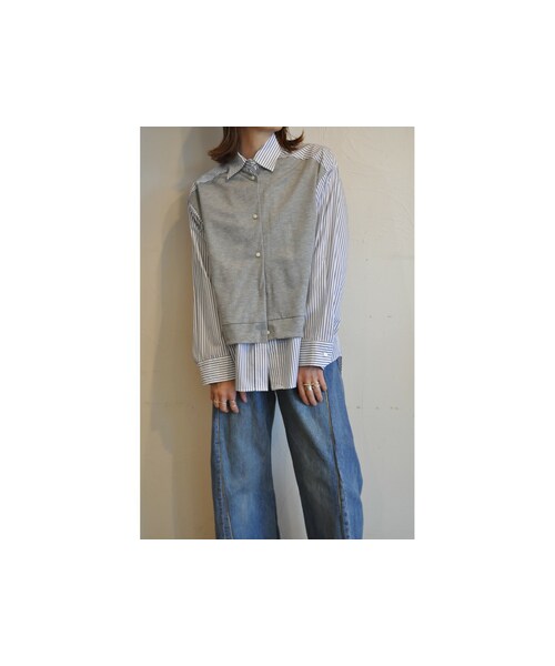 シャツ&ベストの重ね着風シャツ。 フロントオープンで羽織りとしても使えます。 サイジングはゆったりめ。 色違いにブラックあり。 ●商品一覧トップページはこちら↓ http://urx3.nu/LHHy