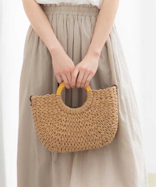丸みのあるフォルムが大人かわいいバッグ。 夏にぴったりな雑材の涼しげ素材でリゾート気分アップ。 サークルのウッドハンドルでこなれ感たっぷり♪ ショルダーは取り外し可能で、 お好みに合わせてお使いいただけます。 内側は荷物が見えず安心の裏地と便利なポケット付き。 タウンユースからビーチ、 レジャーなどにも活躍するアイテムです。 ※ショルダー取外し可 品番:253-121-7743