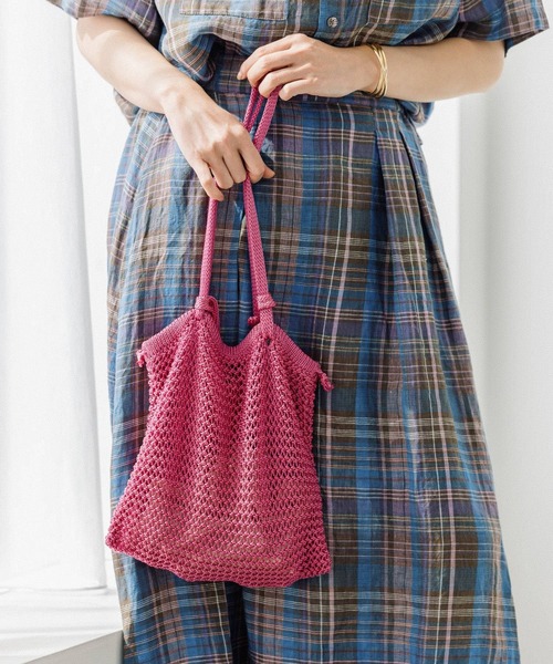 ーーー発色のよい極細の糸をネット状に編み上げたミニトートバッグ。持ち手は前後で片側ずつ解くことがきるので、長さを調節することも可能。口元は巾着で開閉できます。その日の気分で中のポーチや巾着を変えて合わせることでコーディネートのポイントになるアイテムです。ーーー