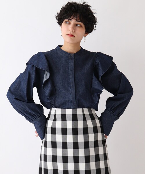 【My style is...掲載】 フェミニンなフリルデザインがポイントの、ライトオンスデニムで仕立てたブラウス。 フリルのデザインや、長めのカフスなど、女性らしいディティールが詰まったブラウスですが、 クラシカルなバンドカラーに、スッキリとした比翼仕立てのシャツタイプなので甘くなり過ぎず、大人カジュアルなスタイルに。 裾はシャツテール(ラウンド)で、インでもアウトでも着用可能。 トレンドのデニム素材を、ブランドらしいデザインに落としたおすすめのブラウスです。 スカートにもパンツにも合わせやすく、あえてデニムパンツと合わせたスタイリングもおすすめです。 ご家庭でのお洗濯が可能なのもうれしいポイントです。 --------------- 【C(シー)】 「PLAYFUL FEMININE」をキーワードに、天然素材と美しくポジティブなカラー、ワクワクするようなディティールや、ミックス感のあるスタイルなどファッションの楽しさを詰め込んだ新レーベルです。 こちらの商品は主に春に着用いただける商品です。 モデル情報:身長163cm B80 W60 H89 着用サイズ:38(M) 店舗へのお問い合わせ商品番号:637-84041 ●製品寸法: 34(SS):着丈61cm B94cm 袖丈61cm 肩幅36cm 36(S):着丈61cm B97cm 袖丈62cm 肩幅37cm 38(M):着丈62cm B100cm 袖丈63cm 肩幅38cm 40(L):着丈64cm B103cm 袖丈64cm 肩幅39cm 備考: