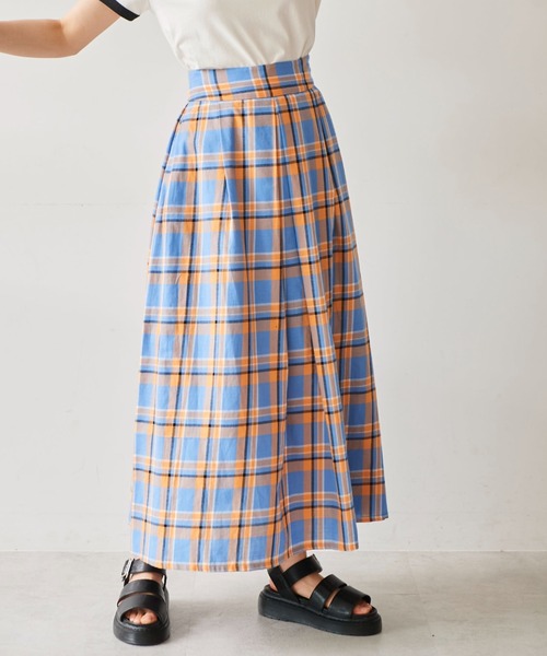 目を惹くパワーカラーのチェック柄スカート。落ち感のあるビエラ生地でリラックスした着心地です。タックをふんだんに入れたマキシ丈のシルエットで主役級の存在感を演出。太めのウエストベルトデザインのため、トップスインするとスタイルアップ見えを狙えます。発色が良いチェック柄なので、ベーシック色のトップス合わせでフェミニンにも、プリントTシャツなどと合わせてカジュアルにも着回しできます。※膝上まで裏地付きです