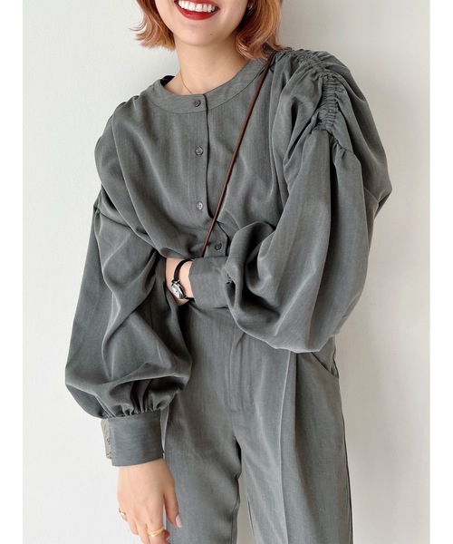 春の装いにぴったりのブラウス。 肩に施された大ぶりのドロストと、 首元のリボンが目を惹く大胆なデザイン。 リボンは気分に合わせて前後どちらでも結ぶことが可能です◎ シワになりにくいしなやかな質感の生地と、 落ち着いたベージュとグレーの色味で大人な印象に。 合わせて発売となるフロントボタンテーパードパンツとの セットアップの着用も可能。 普段使いからちょっとした綺麗めなシーンまで、 幅広く活躍すること間違いなしです♩ ・・・・・・・・・・・・・・・・・・・・・・・・・・・・・・・・・・・・・・・・・・・・・・・ ◆アイテム詳細 素材・・・ポリエステル75% 綿19% ポリウレタン6% 透け感・・・なし 生地の厚さ・・・普通 伸縮性・・・ややあり 裏地・・・なし ・・・・・・・・・・・・・・・・・・・・・・・・・・・・・・・・・・・・・・・・・・・・・・・ ◆サイズ感 身幅が広いので体形いにくい形です。 肩や腕周りもゆったりした着心地ながら、ドロップショルダーで華奢見えするデザインです。 ◆スタイリング デニムと合わせてカジュアルに着たり、 スラックスと合わせて綺麗めなシーンで着たり、様々なシーンで使いやすいです。 別売りのボウタイ2wayブラウスとセットアップで着用するのもおすすめ◎