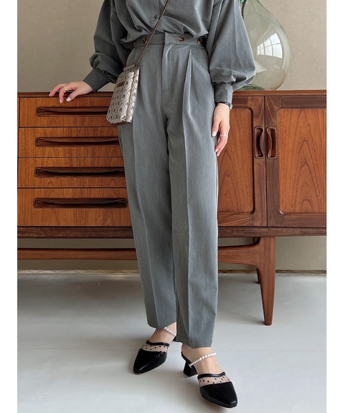 大人な雰囲気が素敵なテーパードパンツ。 シンプルながらもウエスト部分にはかざりボタンをあしらい、 遊び心をプラスしました。 ポケット横のタックが自然な縦ラインを作り出してくれるので、 足長効果も◎ 合わせて発売となるボウタイ2wayブラウスとのセットアップの着用も可能。 普段使いからちょっとした綺麗目なシーンまで、 幅広く活躍すること間違いなしです♩ ・・・・・・・・・・・・・・・・・・・・・・・・・・・・・・・・・・・・・・・・・・・・・・・ ◆アイテム詳細 素材・・・ポリエステル75% 綿19% ポリウレタン6% 透け感・・・なし 生地の厚さ・・・普通 伸縮性・・・ややあり 裏地・・・なし ・・・・・・・・・・・・・・・・・・・・・・・・・・・・・・・・・・・・・・・・・・・・・・・ ◆サイズ感 お尻周りにゆとりがあり、足首にかけて細見があるテーパードパンツ。 ウエストの後ろ部分はゴムになっているので、快適な履き心地です。 ◆スタイリング カットソーと合わせてカジュアルに着たり、 ブラウスと合わせて綺麗めなシーンで着たり、様々なシーンで使いやすいです。 別売りのボウタイ2wayブラウスとセットアップで着用するのもおすすめ◎