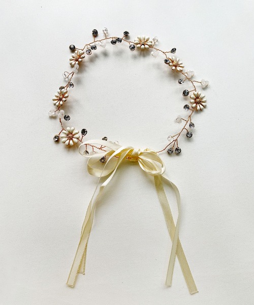 小枝をイメージした繊細なデザインが魅力たっぷりのフラワーヘッドドレスです♪デイジーモチーフに、キュービックやクリアビーズをふんだんに散りばめた、贅沢な一点に仕上げました。リボンでキュッと結ぶだけなので手軽に装着ができます。ウェディングはもちろん、パーティーや発表会、舞台などでも幅広く活躍します!