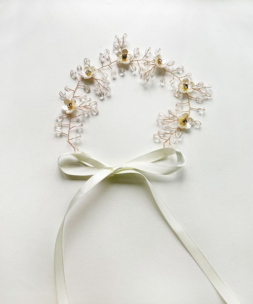 小枝をイメージした繊細なデザインが魅力たっぷりのフラワーヘッドドレスです♪サクラモチーフの中心にはキュービックが、枝にはクリアビーズをふんだんに散りばめた贅沢な一点に仕上げました。リボンでキュッと結ぶだけなので手軽に装着ができます。2本のヘアピン付きなのも嬉しいポイントです。ウェディングはもちろん、パーティーや発表会、舞台などでも幅広く活躍します!【変色を防ぐための注意点】- アクセサリーのサビや黒ずみ、変色を防ぐには 汗や水などの水濡れに気を付けることが大切です。- ご使用後は柔らかい布で汚れや水分を拭き取る ようにしてください。- 空気との接触を減らすため未着用時には ジッパーバッグなどに保管してください。
