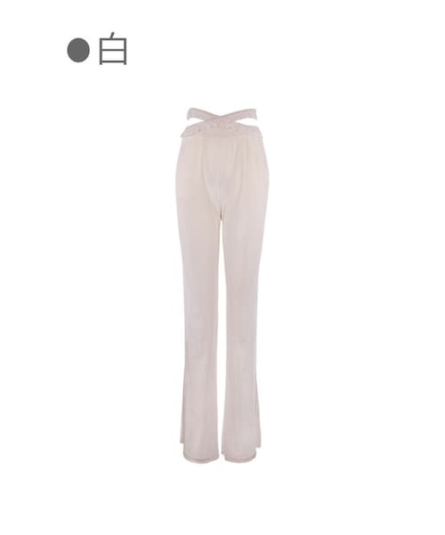 巧妙に仕掛けたウエストフリルデザイン クロスさせてウエストラインを飾るか クロスせず両サイドに垂らすチェーン風 にもできるから2WAYで楽しめる仕様 すっきり落ち感で脚長をアピールしつつ 派手過ぎない光沢感から物語る上品さ 伸縮性あってストレスフリーな穿き心地 デイリーファッションをワクワクさせる1枚 「白」と「ピンク」の2色展開