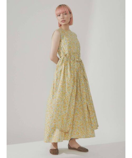 エプロンのような花柄ワンピースは、どこか懐かしく少女のような雰囲気に。ウエストのリボンの調整によってギャザーの寄り方、ウエストのシルエットが調整できるうれしい1枚です。薄手でさらっとしたコットン素材なので、これからの季節に涼しく着用いただけます。ストレスフリーな着心地がうれしい1枚。カジュアルなTシャツに合わせて着ても〇