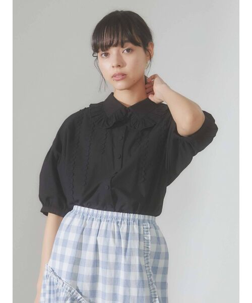 フリルカラーが愛らしいブラウス。 タックのように並んだお花のテープやパフスリーブが 可愛らしさをさらにプラスしてくれます。 薄手のコットン素材で これからの季節にさらっと涼しく着用いただけます。 フレアスカート、ミニスカートなどを合わせて girlyなスタイリングを楽しんでください。