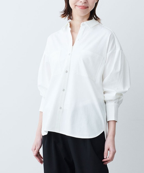 カットソーのしなやかさで 瞬時にこなれるシャツブラウス マニッシュなシャツの格好良さに、ほのかな女性らしさが宿るシャツブラウスです。 タックでふんわり仕上げたドロップショルダーや大きめの胸ポケットなど、旬のディテールを投入。 布はくに見えるしなやかな肌心地のカットソーは、ほんのり光沢ある表面感で、さりげない装いも美しく演出。 お仕事モードから、こなれカジュアルまで着まわせるからワードローブに必携、頼れる大人の新定番です。 ■FROM IEDITプランナー ―生地の厚さ:通常の厚みです。 ―透け感:薄い色はインナーに合わせる色により、透ける可能性があります。 ―伸縮性:あります。 ―コメント:しなやかな素材感と美しい表面感がきちんとシャツ見えして、伸びやかな着心地がらくちんなシャツブラウス。こなれ感のあるシルエットやタックデザインでカジュアルシーンにも活躍します。