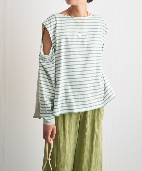 - SPRING SUMMER COLLECTION - 前後の異なる表情がトレンドライクな大人ボーダーカットソー 【MATERIAL】 GIZAコットン(ギザコットン)をブレンドしています。 GIZAコットンならではの柔らかさと光沢感のある表情が魅力です。 ご自宅で手洗い可能な商品です。日本製 【GIZANDY(ギザンディー)】 ナイル川流域で生産されるエジプト超長綿である"GIZA"をベースにした オリジナルブレンド綿を使用しています。 繊維強度があり、コットンながらも上品な光沢感や柔らかい風合いが特徴です。 【DESIGN&COORDINATE】 後身頃にフレア要素を入れたオーバーサイズTシャツです。 肩の釦はお好みで開けて着用も可能で ロングスリーブ、カットアウト、腕を出してノースリーブとしても 幅広い着回しアレンジが叶います。 前後の異なる無地配色もアクセント。 ゆるっと程よいオーバーサイズが大人のリラクシースタイルを格上げしてくれます。 ≪カラー展開≫ ■ダークブラウン(背面:ダークブラウン) ■ライトグリーン(背面:ライトグリーン) ■ブルー(背面:ホワイト) ■ラベンダー(背面:ホワイト) SERIES ■ノースリーブボーダー(H8920) ■長袖ボーダー(H8921) ******************* 生地の厚さ:普通 透け感:なし 伸縮性:あり 光沢感:なし 裏地:なし 洗濯:手洗い可 原産国:日本 ******************* ※着用、お取り扱いの際は、商品についている品質表示とアテンションタグを必ずご確認下さい。 ※着用商品はサンプルです。サイズ等の仕様に若干の変更がある場合がございますので、予めご了承ください。 ※照明の関係により実際のものと色味が違って見える場合があります。