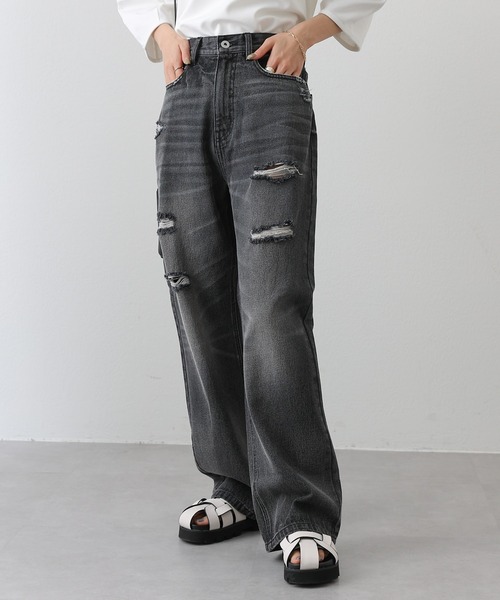 【程よい太さのダメージジーンズ】ロングシーズン着用していただけるストレートパンツ。ハイウエストでウエストマークもしっかりできて、ストレートの形が脚をスラッと見せてくれるので脚長効果間違いなしのアイテムです。大きすぎないダメージ加工がきつくなりすぎず、どんなコーディネートにも合わせやすいです。・ストレートシルエットで美脚効果抜群・ロングシーズン着用可能・程よいダメージ加工ジーンズ【コーディネート】プリントTシャツなどカジュアルなアイテムと合わせた古着風なスタイリングがおすすめです!ダメージ入りなので、あえてきれいめブラウスやジャケットなどの外すのも◎足元はスニーカーや厚底サンダルで合わせても、ミュールやパンプルと合わせて女性らしさをプラスしていただくのも可愛いです。■素材・洗濯についてコットン:98%,ポリウレタン2%洗濯:洗濯機洗い可※こちらの商品は、WEBと一部店舗での取り扱いになります。※着用、お取り扱いの際は、商品についている品質表示とアテンションタグを必ずご確認下さい。※商品タグに記載されている商品名がWEBでの表記名と異なる場合があります。※画像の商品はサンプルです。実際の商品と仕様、加工、サイズが若干異なる場合がございます。 ※照明の関係により、実際よりもやや明るく見える場合がございます。またパソコンなどの環境により、若干製品と画像のカラーが異なる場合もございます。予めご了承くださいませ。 【お気に入り登録】してお得な情報をCHECK!!・「商品のお気に入り登録」で再入荷通知や、ラストの通知、セール通知も受け取ることができます。・「ブランドのお気に入り登録」で新商品や再入荷など、お得な情報を受け取ることができます。