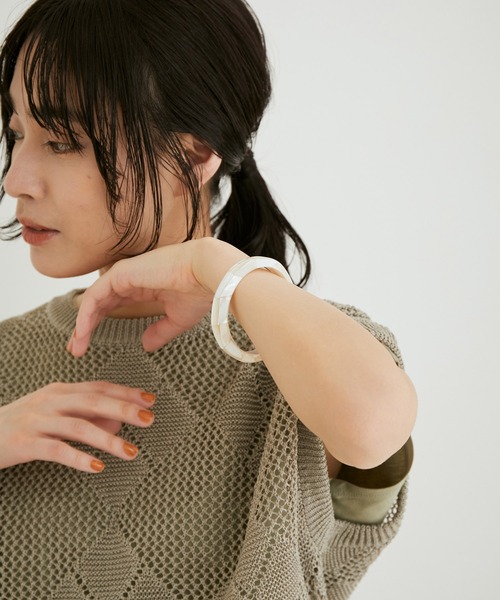 シェルをモザイクタイルのように組み合わせた素材が特徴的なバングル。やや細目の幅にしており、どんな洋服にも馴染みの良いデザインです。シンプルなスタイリングのアクセントとして取り入れるのがおすすめです。※天然素材のため、1つずつの色目や模様が若干変わる事がございます。不良品ではないため商品特性としてご了承ください。■モザイクシェルシリーズ一覧商品番号:SHZ42000商品名:モザイクシェルバングル商品番号:SHZ42010商品名:モザイクシェルスクエアピアス商品番号:SHZ42020商品名:モザイクシェルスクエアイヤリング