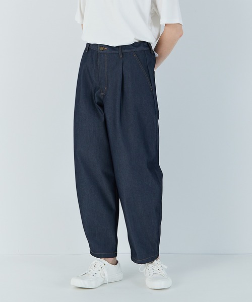 ペットボトルのリサイクルポリエステル原料を使用し、特殊製法で紡績する事でデニム調に仕上げた生地は、独特なシャリ感のあるドライタッチが特徴でSOLOTEXを使用した、ストレッチ性と抜群のキックバックをあわせ持つ素材。 そんな生地を使ってゆったりとしたリラックスシルエットが程よいヌケ感を出しているカーブパンツはヒップから太ももにかけてはユトリを持たせながらも、フロントのタックや脇のゆるやかなカーブによりスッキリとした印象に仕上がっています。 ウエスト部分も後がゴム仕立てになっているのでイージーに着用が出来ながらも、フロントはスッキリとした仕立てにする事で、シャツやTシャツをインした際もしっかり感を演出してくれます。 公園の遊具や砂場の山などをアイコニックに取り入れた「三角」がポイントのヒップポケットのステッチはシンプルな中にアクセントを効かせてくれます。 紙パッチが三角形なところもブランドの遊び心が効いたユニークなデザインに。 後中心部分のベルトループも3本と細かなところまでさり気ないアクセントが満載です。 サイズは0,1,2,3と4サイズ展開があり、サイズの変化であえてルーズに楽しむ事も出来るジェンダーレスなアイテムです。 通常のインディゴデニムとは違い、色落ちがほとんどなく、キレイで光沢のある表面感がそこなわれずに着用できます。 素材はもちろん、水を汚さないというサステナブルにも配慮した取り組みをしています。 *こちらの商品はユニセックス商品です。 【FUDGE】 4月号掲載商品