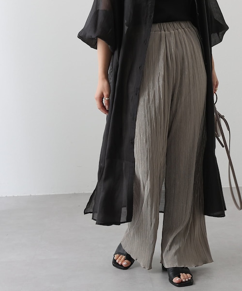 【シンプルで着やすいフルレングスプリーツパンツ】春夏色カラー新登場!さらにシルエットがアップデートされ、リラックスしたストレスフリーな履き心地が叶うパンツです。こだわりのストレートラインは、気になるヒップや太もも、ふくらはぎをカバーしてくれます。ストンと真っ直ぐ落ち感のあるシルエットで、裾にはメロウフリル加工を施しました。ウエスト周りは、総ゴム入りでゆったりとしています。・上品な光沢と細プリーツが大人な印象のロング丈パンツ・安心感のある裏地付き・ウエストはゴムでウエスト内の紐で調節可能・着心地がよくデイリーユースやルームウェア(部屋着)としても◎【コーディネート】セットアップとしての着用も可能。トップスの種類を選ばず、着回しのきくコーディネートしやすいパンツです。シンプルなロンTに合わせたり、シャツ、ブラウスとの相性も抜群です。チュニック丈のプルオーバーや、スリット入りのワンピース、シャツワンピースなどとのレイヤードにもおすすめのパンツです。足元はスニーカーでもバランスを取りやすく、華奢なサンダルやフラットパンプスで抜け感を出すのもおすすめです。同素材シリーズCWA1021101A0001 サテンミニプリーツスカートCWA1021404A0005 サテンミニプリーツノースリーブチュニック■素材・洗濯について ポリエステル100%洗濯:手洗い可裏地:ショートパンツほどの裏地あり※こちらの商品は、WEBと一部店舗での取り扱いになります。※着用、お取り扱いの際は、商品についている品質表示とアテンションタグを必ずご確認下さい。※商品タグに記載されている商品名がWEBでの表記名と異なる場合があります。※画像の商品はサンプルです。実際の商品と仕様、加工、サイズが若干異なる場合がございます。 ※照明の関係により、実際よりもやや明るく見える場合がございます。またパソコンなどの環境により、若干製品と画像のカラーが異なる場合もございます。予めご了承くださいませ。 【お気に入り登録】してお得な情報をCHECK!!・「商品のお気に入り登録」で再入荷通知や、ラストの通知、セール通知も受け取ることができます。・「ブランドのお気に入り登録」で新商品や再入荷など、お得な情報を受け取ることができます。