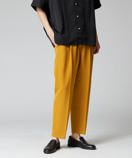 【デザイン】 2タック入った、綺麗な見た目のワイドテーパードシルエットパンツです。 腰周りはゆったりと、裾にかけてややテーパードしたシルエットは、足を綺麗に見せてくれる効果があります。 また、センタークリースが入っており、スラックス見えなのもポイント。 楽な着心地ながらも、ややかっちりとした印象も持ち合わせているので、綺麗目名アイテムとも相性が良いです。 ルーズシルエット。 【素材】 ポリエステル特有のシャリ感がありつつも、ふんだんなストレッチ素材が入ることで、ややドレープの効く素材に。 滑らかな素材感は肌当たりが心地よく感じます。 生地の凹凸感が、清涼感を出し、軽快な着心地です。 【コーディネート】 メインパンツとしてはもちろん、セットアップ対応のシャツジャケットを合わせて、大人な雰囲気を出すことが出来ます。 ワイドテーパード型になっているので、足のラインに清涼感、清潔感を持たせることができます。 きれいな見た目のため、カジュアルのみならずセットアップスタイルや、在宅、リモート等幅広くお使いいただけます。 【同素材】セットアップシャツジャケット品番:00446030002