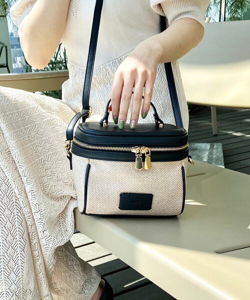 スクエアフォルムがトレンド。ボックス型のバニティバッグ。【デザイン】スクエアフォルムのバニティバッグ。口元はメタルのファスナーでぐるりと開閉していただくデザイン。前面のロゴ素押しのタブ使いもクラシカルな雰囲気を醸し出しています。取り外し可能なロングショルダー付きで斜め掛けでもお持ちいただけます。※ポケット数:内側×1【素材】001/062カラーは表面感のあるフェイクレザーを使用しています。319カラーはベージュ見えの雑材シートとブラックのフェイクレザーを使用して、大人っぽく仕上げています。店舗へのお問い合わせ商品番号:C71-14040●製品寸法:00:高さ15cm 幅(上部)18.5cm 幅(下部)18cm マチ10.5cm 持ち手上がり5.5cm 付属ショルダー対応サイズ63~120cm備考:重量:約310g(サンプル重量)