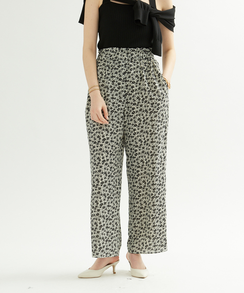 *POINT*夏に近づくと穿きたくなる、プリントのイージーパンツ。モノトーンの小花柄で甘くなく、大人シックに合わせられる◎*DESIGN*ぐるりウエストゴムでストレスなく楽に穿けるデザイン。少しワイド幅のテーパードラインなので、カジュアル過ぎないシルエットです。*COORDINATE*女性らしいフェミニンなアンサンブルニットとあわせ、少しリゾートチックに女っぽいスタイルがおすすめ!もちろんデニム感覚で、Tシャツやオーバーシャツと合わせてカジュアルに合わせるのも◎同素材のブラウス(NO.31440310008)と合わせ、セットアップとしても着用できます。柔らかく、肌あたりは少しひんやりと感じるような涼感ある素材。皺になりにくく、手洗い可能なポリエステル素材。洗濯:手洗い可