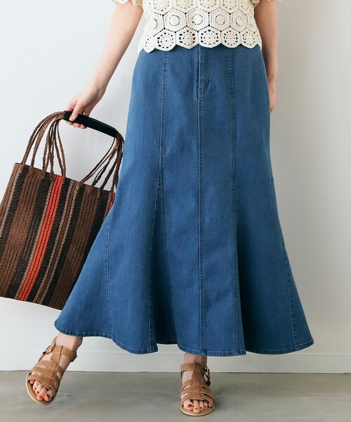【デザイン/シルエット】8枚接ぎのマチ入りデザインで、身体に沿った美しいS字ラインが叶う立体的なシルエットです。ステッチを効かせたデザインでデニムならではの表情ある見えがかりがお洒落なムード漂う1枚です。後ろ中心ベルト部分にゴムを入れているので可動性があり、フィット感ありながらも楽な履き心地です。フロントは本格的な金属ファスナー開きになっています。※ポケット数:後ろ【素材】微ストレッチが入ったデニム素材です。※裏地なし【カラー】ディープブルー、ライトブルーの2色展開です。こちらの商品は主に夏に着用いただける商品です。モデル情報:身長166cm B80 W59 H86 着用サイズ:38(M)店舗へのお問い合わせ商品番号:768-74035●製品寸法:01(S):総丈86cm W65~72cm H94cm02(M):総丈88cm W68~75cm H97cm03(L):総丈90cm W71~78cm H100cm04(LL):総丈92cm W74~81cm H103cm備考: