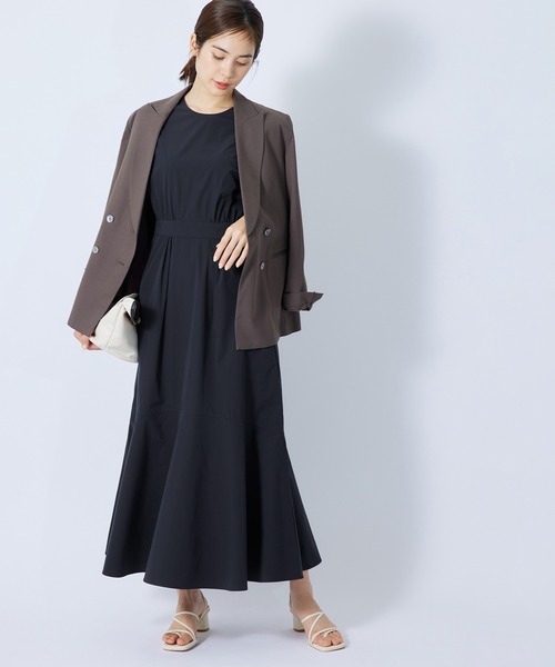 【素材】天然素材ライクなポリエステル糸を使用したシワになりにくく、マットな艶が特徴の素材を使用。ハリ感と光沢感でシンプルながら華やかに見せてくれる為なにもしなくても着映える一枚です。 【デザイン】ハイウエスト切り替えのキレイメな一枚着ドレスはスカート部分かマーメイドスカートになっている今季らしい立体的なドレス。クルーネックでフォルムスリーブのドレスはトップスとスカート来たような見え方のドレスにデザイン。素材のツヤと張り感が甘さではなくモダンな印象に見せてくれます。後ろウエスト部分がゴムシャーリングでデザインされているのもデザインポイントになり着心地の良さをプラス。腰位置が高くウエストマークされているのですっきり見え、小柄な方でもスタイルアップが叶います。 【カラー】アーモンドブラウン、ネイビーの2色展開【スタイリング】一枚着で完成されますがアウターの合わせとしてはショート丈のリバーコートやマウンテンマーカーなどのブルゾン、合わせで少しカジュアルなスタイリングにエレガンスを掛け合わせるのがおススメです。足元は細ヒモ系サンダルやフラットなグルカサンダルなどでモダンな印象にスタイルを組んでください。お袖があり肌の露出を避けながらも薄手で軽い素材は夏の冷房対策にもびったりです。スカート部分のマーメードラインがキレイ目にはもちろん、あえてキャップにスニーカーで合わせるなど女性らしさとカジュアルをMIXしたコーディネートもおすすめです。----------------------------透け感:なし裏地:なし伸縮性:なし光沢感:少しあり生地の厚さ:中肉開き方:ファスナーポケット:あり洗濯方法:洗濯機可----------------------------【モデル情報】モデル身長:167cm着用サイズ:38※画像の商品はサンプルです。 実際の商品と仕様、加工、サイズが異なる場合がございます。※撮影場所やライティング、お使いのモニター環境によって色の見え方が異なる場合がございます。※商品の入荷状況は、店舗在庫よりご確認いただけます。ご不明点は、店舗までお問い合わせください。