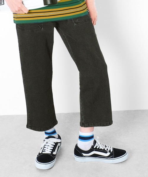 接触冷感デニムを使用した8.5分丈パンツです。 肌に触れた瞬間のひんやり感が涼しく、これからの季節にピッタリなアイテム◎ 7分丈パンツより丈が長く、ゆったりとしたサイズ感でリラックスして着用でき、足元のコーディネートもお楽しみいただけます。 程よいストレッチの8.5ozデニムを使用。 穿き慣れたような本格的な色落ち加工に、ベイカーポケットでワークな雰囲気をプラス。 ファスナー開き+アジャスターゴム仕様で、ウエストまわりはスッキリと仕上げました。 合わせやすくカジュアルな印象のデニムブルーを2色と、モノトーンコーデにオススメなブラックデニムの3色をご用意♪ 派手めなプリントやオーバーサイズなトップスに、ラインソックス、スニーカーを合わせたストリートコーデがオススメ! ロングシーズン着用いただけるアイテムです◎ 【ポケット】 フロントポケット×2、ヒップポケット×3 【モデル】 身長159.5cm、体重41kg、着用サイズ:160cm(クロ) 身長147cm、体重33kg、着用サイズ:150cm(Lブルー) 【ご注意点】 ■色落ち加工を施し、職人により手作業で仕上げている為、製品によって風合いや寸法に個体差がございます。あらかじめご了承ください。 ■商品特有の匂いがございますが、数回ご洗濯いただくことで軽減されます。 ■この製品は非常に色落ち、色移りしますのでご着用の際は下記の点に十分ご注意ください。 ・着用と洗濯を繰り返すことで色落ちが進み、使い込んだ風合いになります。 ・白・淡色系衣料品と合わせて着用されると摩擦によって他の衣料品に色移りします。 ・雨の日、汗等濡れた状態は、さらに他の衣料品等への色落ち色移りがしやすくなります。 ・保管の際は、色移りを防ぐ為、白・淡色の衣料品と重ねないでください。 ・日光(または照明)を長時間受けると黄変の恐れがありますので着用・保管の際はご注意ください。