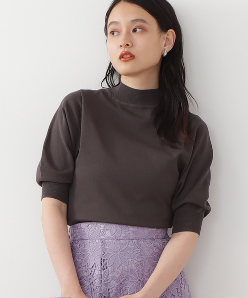 ほどよい伸縮性と肌触りがいいプレーティング天竺で仕上げた五分袖ニット。ボトルネックで顔まわりをすっきりまとめ、二の腕をカバーする五分袖で大人っぽく着られます。ボディラインを拾いすぎないシルエット、裾はフィット感のあるリブ編みなのでインもアウトもしやすいです。パンツ、スカートにも着回しできる万能さもポイントで、デイリーユースに活躍できます。