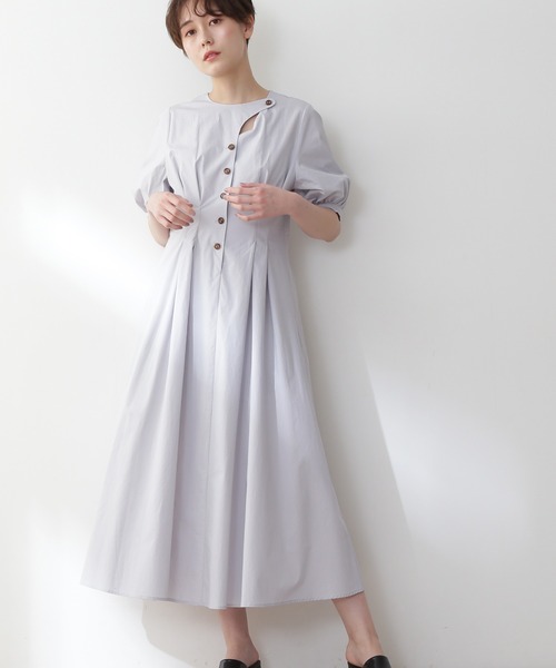 前立てのカーブフラップがアクセントとなるモードな雰囲気のコットンワンピース。ウエストに向けたタックデザインでシルエットをシェイプし、女性らしいバランスに仕上げています。袖はボリューム感があり、二の腕をカバーしてくれます。足元にグルカサンダルやミュール、スニーカーなど、カジュアルからキレイめまでテイストを変えられるのも嬉しいポイントです。