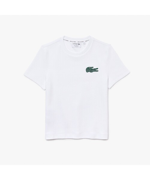 ラコステを象徴する鹿の子素材で仕立てた、トレンド感あるシルエットのクルーネックTシャツ。左胸にはオーバーサイズのクロックグラフィックを配置。グラフィック内をレースで表現することで、カジュアルな表情の中にもフェミニンなエレガンスを表現した、フランスメイドの1枚です。