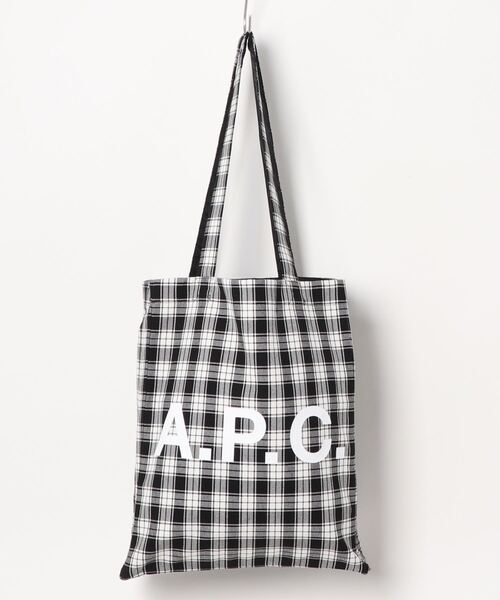 チェック柄の縦長リバーシブルトートバッグ. コットン/ナイロン. ハンドキャリーまたは肩掛け用の大きなハンドル2本. 内側にポケット. 前にA.P.Cロゴのプリント. 同色のステッチ. サイズ: 37 x 31 x 8cm.