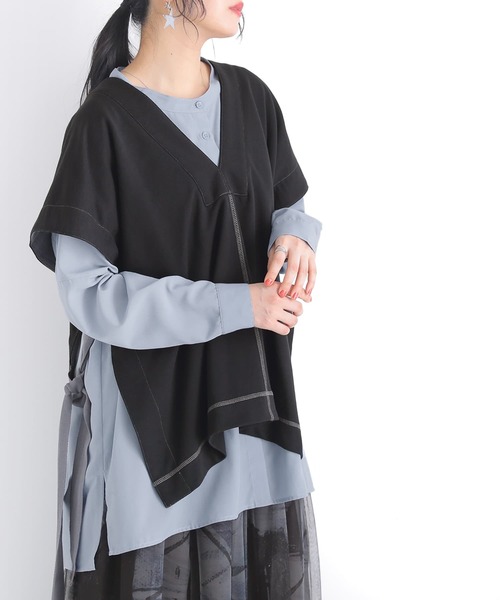 『ラフに重ねてお洒落魅せ。』 着るだけでお洒落上級者見せを叶えるレイヤードベスト♪ ほんのり抜き襟になる肩落ちシルエットで、ラフなスタイルが完成する。配色使いの太めのサイドリボンやステッチがセンスに差をつけます。動きに合わせてさりげなく見える裏側に施した配色テープもお洒落なアクセントに。 肌触りの良い綿混のミニ裏毛スウェット生地は、程よい厚みで重ね着次第でオールシーズン活躍する1着です。 今、好きな物、興味あることを自由な発想で表現できる≪ n'OrLABEL ≫。 「実用性と機能性、そして遊び感覚」、多面性を楽しめるピュアでモードなデザインライン。 こなれた旬の装いを叶える≪n'OrLABEL≫ミニ裏毛配色ステッチベストです。
