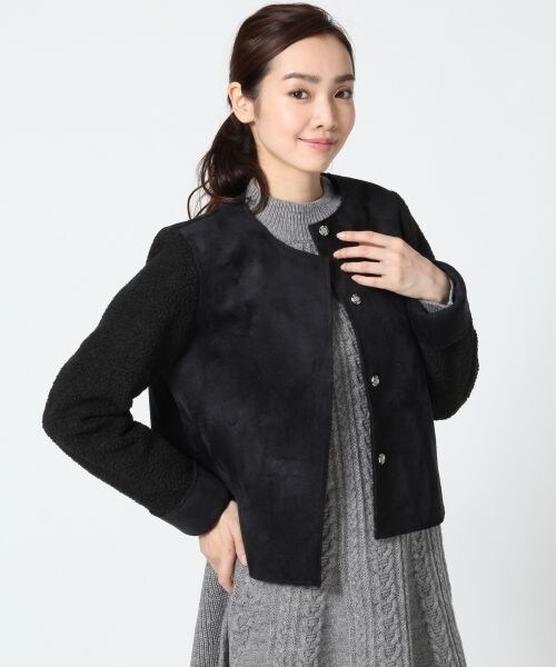 軽くて温かいフェイクムートンを使ったノーカラージャケット。起毛感のある身頃とボア使いのアームが見た目にも温かそうなアイテムです。ストール類を合わせやすいノーカラーデザインは冬に向けて重宝するだけなく、今年らしいタートルネックアイテムとの相性もバツグンです。やや厚みのあるデザインなので、すっきり見えるような着丈で仕立ててあるところも隠れたポイントです。