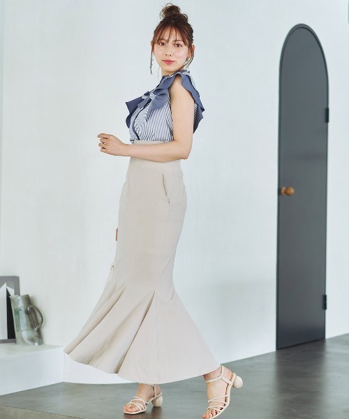女性らしく華やかなシルエットで魅了するマーメイドスカート♪ 【Design】 ・シルエットで女性らしさを見せるマーメイドスカート。 ・膝の位置からマチを入れることで、たっぷりとボリューム感のあるフレアラインを表現し、歩く度に揺れ華やかさがUPします♪ ・バックウエスト部分はシャーリングの幅を広くとることで、ヒップラインが出すぎないようになっております。 ・両サイドにはウレシイポケット付き。 ・前フォック、ファスナータイプ。 【Fabric】 ・ポリエステルとポリウレタンの混紡素材なのでシワになりにくく、ご自宅でお手入れができるので安心してお召いただけます。 ・スムースな裏地付き。 ・ベーシックに取り入れやすいベージュ、モカ、ブラックの3色展開となります。 【Care】 手洗い可能 M:(02):着丈99cm/ウエスト65㎝/ヒップ93㎝ S:(01):着丈97cm/ウエスト62㎝/ヒップ90㎝