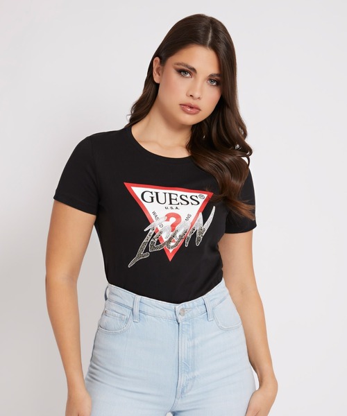 定番のトライアングルロゴに「ICON」の刺繍を組み合わせたクールなTシャツ。 ビーズやビジューを散りばめて立体的に仕上げた刺繍が華やかな存在感をプラス。 クルーネックタイプのベーシックなシルエットでバランスよくスタイリング出来るのも嬉しいポイント。 綿100%素材のさらりとした着心地の良さで、愛用率も高まりそう。 ■GUESSについて 1981年にマルシアーノ兄弟により創設され、ジーンズブランドとして始まったGUESSは、ブランド創設43周年を迎えました。 ヨーロピアン・スタイルとアイコニックなビジュアルでグローバル・ライフスタイルブランドと成長し、トータルコレクションを世界80カ国以上で1500以上の店舗で展開しています。
