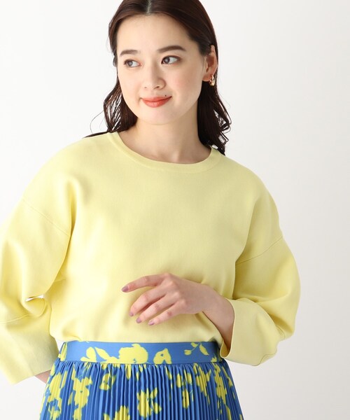 サスティナブルかつ良質な素材にこだわった、デザインスリーブニット 【デザイン】 構築的なスリーブデザインがポイントのデザインニット。 リラックス感あるボクシーなシルエットで、自然な抜け感を演出。 ネック周りはコンパクトにまとめ、キレイ目にまとめています。 成型でデザインしたボリュームスリーブが印象的で、やや長めの5分袖程度の袖丈でシーズンを問わず活躍。 タックアップで自然なニュアンスを加えて着こなしていただくのもおすすめです。 ボトムのシルエットを選ばない、ほどよい丈感でまとめた使いやすい一枚。 キレイ目な素材感に、普段使いしやすい機能性もプラスし、シーンを問わずキレイ目からカジュアルまで活躍するニット。 【素材】 レンチング社の手掛けるサスティナブルなエコヴェロレーヨンを使用し、極細番手のコットン(綿)と合わせることで、 美しい表面感と程よい落ち感、光沢感を持たせた良質感のあるニット素材。 ミラノリブで編み立てることでほどよい厚みとハリを持たせ、一枚で主役になるニットに。 ご家庭の洗濯機で洗えて、ピリングも起きにくい機能性もうれしいポイントです。 ※こちらの商品はやや透け感があるため、インナーの着用をおすすめします。 ※WEB限定サイズ:34(SS),42(LL) 【ECOVERO(R)/エコヴェロ】 レンチングTMエコヴェロTMは、通常のレーヨンと比較すると環境フットプリント(水汚染、CO2排出)が最大50%削減できる、 環境にも配慮した素材です。 EUエコラベルを取得しており、SDGsの達成にも繋がります。 花王「エマール」の検証により、ご家庭で洗えることが実証されています。 エマール検証済 洗えるニット おしゃれ着用洗剤 売上NO.1 ブランド※1)、花王「エマール」で洗うと、縮み・色あせを防ぎ、カタチきれいに仕上がることが実証※2)されました。 ※1)インテージ SRI おしゃれ着用洗剤市場 2018年6月~2019年5月 金額シェア ※2)エマールにて洗たく機で3回洗たく、ネット使用、室内平干しでの評価。 こちらの商品は主に夏に着用いただける商品です。 モデル情報:身長166cm B80 W58 H83 着用サイズ:38(M) 店舗へのお問い合わせ商品番号:637-14039 ●製品寸法: 34(SS):着丈50cm B92cm 袖丈29cm 肩幅44cm 36(S):着丈51cm B95cm 袖丈30cm 肩幅46cm 38(M):着丈52cm B98cm 袖丈31cm 肩幅48cm 40(L):着丈53cm B101cm 袖丈32cm 肩幅50cm 42(LL):着丈54cm B104cm 袖丈32cm 肩幅52cm 備考: