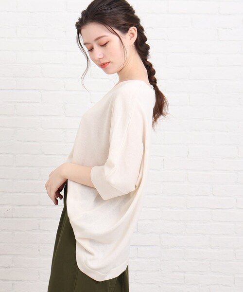 【デザイン】 麻混素材のシャリ感のある糸を使ったドルマンスリーブニット。 見た目はシンプルですが、首元がすっきり見えるVネックライン、 前後差のある裾カーブなど、着回しがしやすい範囲内でさりげなく今っぽさを取り入れています。 ドルマンスリーブでリラックスして着ていただけます。 春先~夏まで着用できる、大人っぽく上品なアイテムです。 【生地感】 麻をブレンドしたドライタッチな質感が特徴です。 ※こちらの商品はやや透け感があるため、インナーの着用をおすすめします。 モデル情報:身長160cm B78 W59 H85 着用サイズ:00(FREE) 店舗へのお問い合わせ商品番号:C62-14326 ●製品寸法: 00(FREE):前着丈61cm 後着丈66cm 裄丈57cm 備考: