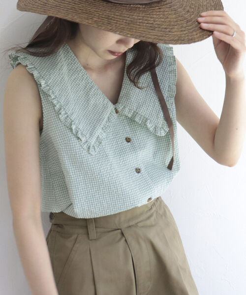 ◇fredy emue◇【2022 SS】ギンガムチェック ビッグカラー ブラウス●point・フリルをあしらったBIGカラーがポイントのブラウス・色鮮やかなカラーの着映えするギンガムチェック・やや深めのVネックが抜け感と女性らしさをプラス・柔らかく軽い着心地でイージーケアがしやすいのも◎・1枚でも、ロンTやタートルをレイヤードしてベストのように着こなすのもおすすめです!透け感:なし裏地:なし伸縮性:なし光沢感:なし生地の厚さ:やや薄手洗濯:手洗い可能●お取扱い上のご注意●*商品を長くご愛用していただきたいため、アテンションタグを必ずご確認の上、着用又はお取り扱い下さい。*店頭及び屋外での撮影画像は、光の当たり具合で色味が違って見える場合があります。商品の色味は、スタジオ撮影の画像をご参照下さい。*商品画像に関しては出来る限り忠実に表示出来るよう努めておりますが、お客様がご利用のモニターの設定及び特性により、実際の商品と比較し色味に若干の誤差が生じる場合があります。*画像の商品はサンプルとなりますので実際の商品と仕様、加工、サイズが若干異なる場合がございます。◇商品のお気に入り登録◇【お気に入りに登録 ♡マークをクリック】を是非ご活用ください! 再入荷の通知や、ラスト1点の通知、セールの通知がいち早く届きます。◇ブランドのお気に入り登録◇新商品や再入荷など、いち早くブランドのお得情報が届きます。