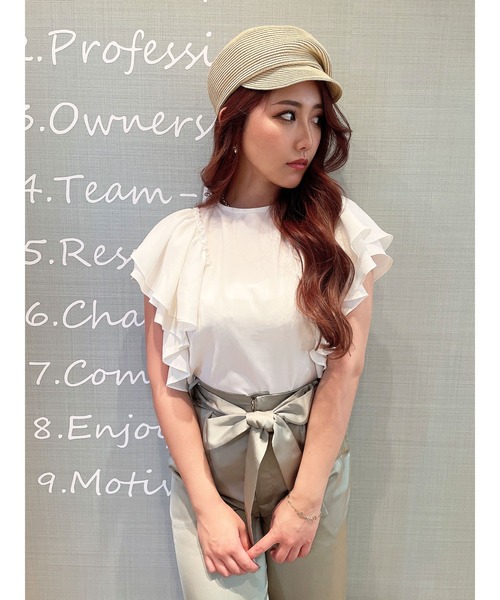 袖の通し方で2WAYのスタイリングが楽しめるオープンショルダートップス。ふんわりとボリュームのあるフリルが、装いを華やかにアップデート。気になる二の腕を華奢に見せてくれる嬉しい効果も期待できます。デートやお呼ばれスタイルにもぴったりの大人可愛いアイテムです。