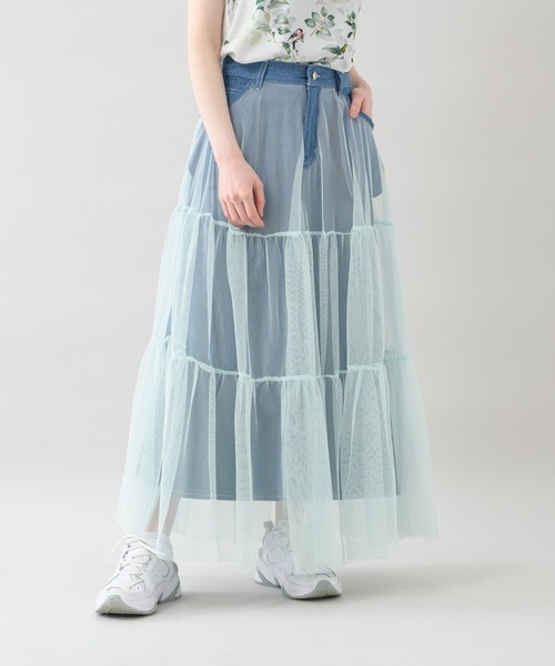 チュールがレイヤードされた春らしい軽やかさのデニムスカート。○POINT・デニムスカートにチュールがレイヤードされた、春らしい軽やかさのデニムスカート。・チュール部分はティアードになっており、程良いボリューム感。・バックポケットはフェイクで座った時もゴロゴロしづらいです。・しっかりとしたデニム生地で、ロングシーズン活躍してくれる優秀アイテムです。○STYLING・スニーカーと合わせてカジュアルスタイルに、ソックスにローファーやパンプスを合わせてフェミニンスタイルに。・無地はもちろん、ボーダーや花柄も合わせ易いデザインです。裏地:なし光沢:なし伸縮性:なし透け感:なし生地の厚さ:厚手ポケット:あり【doll up oops】feminine「女性らしさ」& romantic「女の子らしさ」この2つのキーワードは、女性が自分自身をファッションで表現するにはかかせない言葉。その言葉を、洋服という物の中に表現し続けていく事を永遠のテーマとしています。女性はお洒落して行く場所、会う人によってワードローブを変化させる事が楽しみ、喜びです。そんな楽しみに合わせてセレクトできる個性的なプリントや、インポート風の凝ったデザインをテーマに、女性らしく、可愛らしく演出できる様々なアイテムを提案しています。