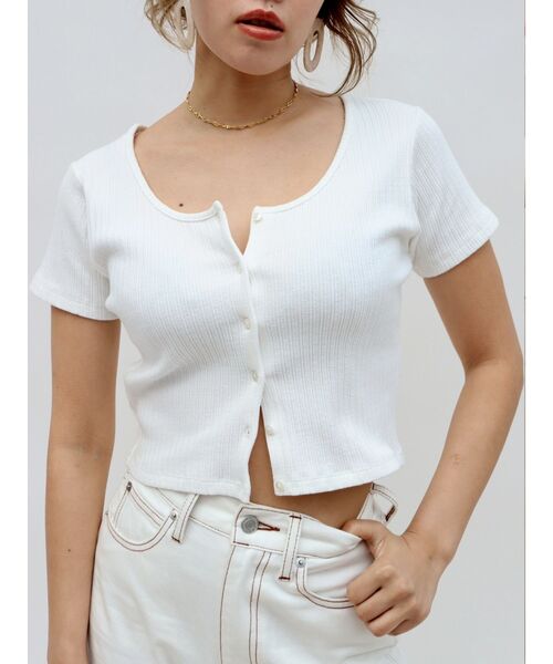 フロントのボタンがポイントのクロップドトップスです。ランダムリブの生地を使用しており、伸縮性のある1枚です。■同素材のワンピースはコチラ>>フロントボタンミニワンピース