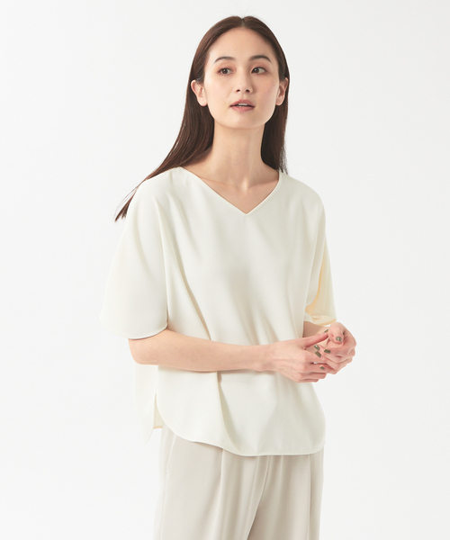 *Detail*Vネック、ボートネックと前後2WAYで着て頂けるブラウス。去年好評頂いたブラウスをブラッシュアップ致しました。肉厚で透けにくく、夏に大活躍間違い無しの逸品。広がり過ぎないフレア感のあるお袖は、甘すぎず、絶妙なバランスで女性らしさをプラスしてくれます。アップデートポイント・去年より丈を2cm長くし、気になる腰回りをカバー。・今年から36.38の2サイズ展開!*Coordinate*夏のONスタイルにぴったりな一枚。一枚着としてはもちろん、ジャケットのインナーとしてもお使い頂きやすい、着回し力の高いアイテム。同素材のパンツ(No.32440050014)とセットアップとしても着ていただけます。こちらのパンツとはすべてのカラーと合わせが可能ですのでお好きな組み合わせで着ていただくのがGOOD!