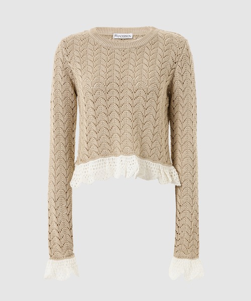 JW ANDERSON フェミニンとマスキュリンが交差する独創的なスタイルで、ファッションデザインの最先端を行く JW Anderson(ジェイダブリュー・アンダーソン)。 2008年にロンドンファッションウィークにて初のメンズコレクションを発表し、世界中の評論家やバイヤーから高い評価を獲得しました。2010年にはレディースコレクションの展開を開始し、英国で最も権威あるブリティッシュ・ファッション・アワードを始めとする様々な賞を受賞するほか、LVMH からの出資を受けるなど、ファッション界に絶対的な存在感を示しています。 ショート丈で、裾にフリルのついたデザインのニット。