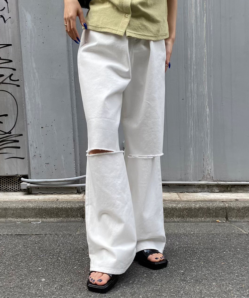 【2022 SS】 Oriens JOURNAL STANDARD Oriens 人気デニムからクラッシュワイドデニムが登場! 膝部分がカットされた大胆なデザインはスタイリングのアクセントピッタリなアイテム。 トレンドのハイウェストだからTシャツやニット、ブラウスとも相性が良いです。 スッキリとしたラインになるシルエットは今年必見の一着です。 ※取り扱いについては、商品についている品質表示でご確認ください。 ※店頭・外での撮影画像は、光の当たり具合で色味が違って見える場合があります。商品の色味は、スタジオ撮影の画像をご参照ください モデルサイズ:身長:167cm 着用サイズ:36 本体:洗濯機洗い(弱)