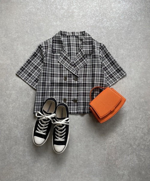 シーズンムード高まるヘビロテ間違いナシのチェックシャツ●detailチェック柄が目を惹く華やかな印象のアイテム。スタイリングにスパイスを与えてくれる一枚に仕上げました。ショート丈でウエスト位置を高く魅せ、スタイルアップ。ダブルブレストで大人っぽいエレガントさもプラス。一枚ではもちろんボタンを開けて羽織りとしても◎●fabric清涼感のある涼しげなサラッとした生地感。シワになりにくいポリエステル素材を採用。身幅がゆったりしているのでストレスフリーに着用可能。●coordinateインナーにキャミやタンクをいれて羽織るだけでトレンドコーデが完成。ロゴTや無地Tでシンプルなコーディネートで韓国風コーデも。ボトムスはスラックスやデニム、フレアパンツと形や素材を選ばずに楽しめます。ブランド品番:30513A232