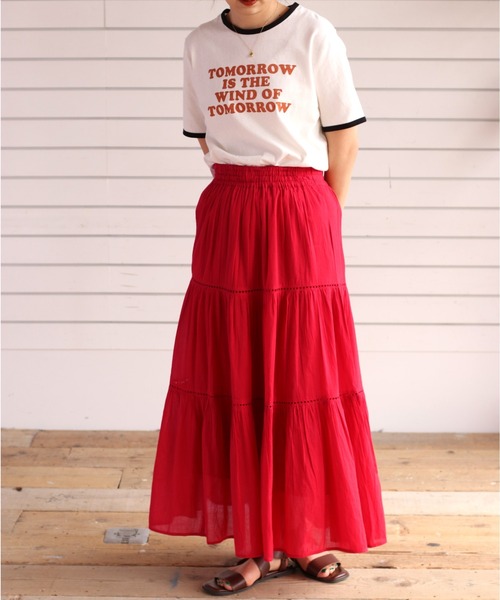 毎年人気のボイルスカートが今年も登場♪◇Point◇春夏にぴったりのカラフルなカラーリングが目を引くスカート。一枚でコーデの主役になること間違いなし!引き続き人気のティアードデザインで、ふんわりと揺れるシルエット。一枚は持っておきたいスカートです。◇Material◇さらっとした素材で夏にぴったりのスカート。同素材の裏地がすね辺りまでついており、足首あたりは少し透け感があります。ウエストは総ゴムなので、動きやすいのも嬉しいポイント。◇Coordinate◇ティアードデザインと施されたレースが女性らしい印象なので、ノースリーブや半袖Tシャツと合わせてバランス良く着用するのがおすすめです。※照明や天候により実際の色味と異なって見える場合がございます。ご了承くださいませ。